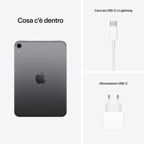 Apple iPad mini Wi-Fi + Cellular 256GB – Grigio siderale. Dimensioni schermo: 21,1 cm (8.3″), Risoluzione del display: 2266 x 1488 Pixel, Tecnologia display: LED. Capacità memoria interna: 256 GB. Famiglia processore: Apple, Modello del processore: A15. RAM installata: 4 GB. Risoluzione fotocamera posteriore (numerico): 12 MP, Tipo di fotocamera posteriore: Fotocamera singola, Risoluzione fotocamera frontale (numerico): 12 MP. Wi-Fi standard: Wi-Fi 6 (802.11ax). Assistenza funzione GPS (A-GPS). Peso: 297 g. Sistema operativo incluso: iPadOS 15. Colore del prodotto: Grigio