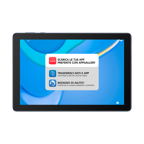 Huawei MatePad T 10. Dimensioni schermo: 24,6 cm (9.7″), Risoluzione del display: 1280 x 800 Pixel. Capacità memoria interna: 32 GB. Frequenza del processore: 2 GHz, Famiglia processore: Hisilicon Kirin, Modello del processore: 710. RAM installata: 2 GB. Risoluzione fotocamera posteriore (numerico): 5 MP, Tipo di fotocamera posteriore: Fotocamera singola, Risoluzione fotocamera frontale (numerico): 2 MP. Wi-Fi standard: Wi-Fi 5 (802.11ac). Assistenza funzione GPS (A-GPS). Peso: 450 g. Sistema operativo incluso: EMUI 10.1. Colore del prodotto: Nero, Blu