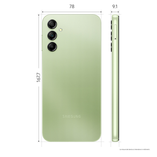 Samsung Galaxy A14 Display LCD FHD+ 6.6″, Android 13, 4GB RAM, 128GB, Doppia SIM, Batteria 5.000 mAh, Light Green. Dimensioni schermo: 16,8 cm (6.6″), Risoluzione del display: 1080 x 2408 Pixel, Tipo di display: PLS. Famiglia processore: MediaTek, Modello del processore: Helio G80 (MT6769V). Capacità della RAM: 4 GB, Capacità memoria interna: 128 GB. Risoluzione fotocamera posteriore (numerico): 50 MP, Tipo di fotocamera posteriore: Tripla fotocamera. Capacità della scheda SIM: Doppia SIM. Sistema operativo incluso: Android 13. Capacità della batteria: 5000 mAh. Colore del prodotto: Verde chiaro. Peso: 201 g