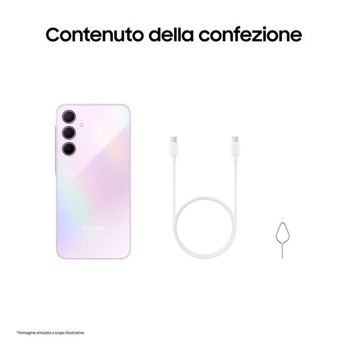 Samsung Galaxy A35 5G Display FHD+ Super AMOLED 6.6”, Android 14, 6GB RAM, 128GB, Dual SIM, Batteria 5.000 mAh, Awesome Lilac. Dimensioni schermo: 16,8 cm (6.6″), Risoluzione del display: 1080 x 2340 Pixel. Frequenza del processore: 2 GHz, Famiglia processore: Samsung Exynos. Capacità della RAM: 6 GB, Capacità memoria interna: 128 GB. Risoluzione fotocamera posteriore (numerico): 50 MP, Tipo di fotocamera posteriore: Tripla fotocamera. Capacità della scheda SIM: Dual SIM ibrida. Sistema operativo incluso: Android 14. Capacità della batteria: 5000 mAh. Colore del prodotto: Lillà. Peso: 209 g