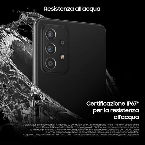 Samsung Galaxy A52s 5G Display 6.5” FHD+ Super AMOLED 128GB Awesome Black. Dimensioni schermo: 16,5 cm (6.5″), Risoluzione del display: 1080 x 2400 Pixel, Tipo di display: SAMOLED. Famiglia processore: Qualcomm, Modello del processore: SM7325-2-AB. Capacità della RAM: 6 GB, Capacità memoria interna: 128 GB. Risoluzione fotocamera posteriore (numerico): 64 MP, Tipo di fotocamera posteriore: Telecamera per quad. Capacità della scheda SIM: Dual SIM ibrida. Sistema operativo incluso: Android 11. Capacità della batteria: 4500 mAh. Colore del prodotto: Nero. Peso: 189 g