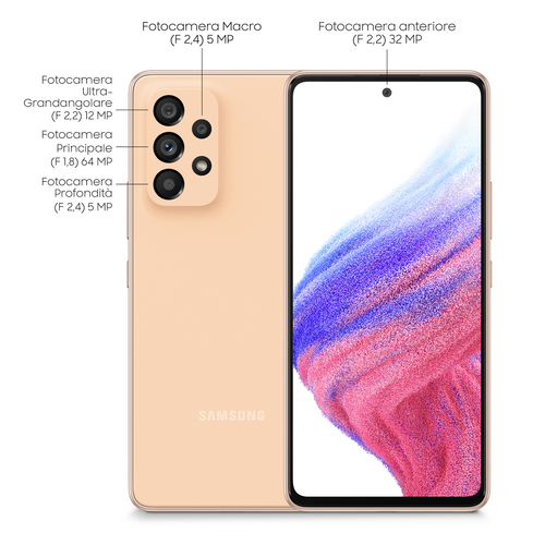 Samsung Galaxy A53 5G Display 6.5” FHD+ Super AMOLED Doppia SIM Android 12, RAM 6 GB , 256 GB, 5.000 mAh, Awesome Peach. Dimensioni schermo: 16,5 cm (6.5″), Risoluzione del display: 2400 x 1080 Pixel, Tipo di display: SAMOLED. Famiglia processore: Samsung Exynos, Modello del processore: 1280. Capacità della RAM: 8 GB, Capacità memoria interna: 256 GB. Risoluzione fotocamera posteriore (numerico): 64 MP, Tipo di fotocamera posteriore: Telecamera per quad. Capacità della scheda SIM: Dual SIM ibrida. Sistema operativo incluso: Android 12. Capacità della batteria: 5000 mAh. Colore del prodotto: Pesca. Peso: 189 g