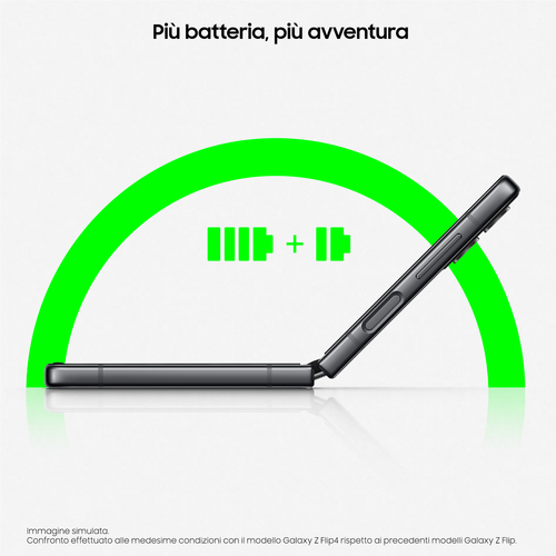 2_Dato stimato in base al profilo di utilizzo dell’utente medio/tipico. Collaudato indipendentemente da Strategy Analytics tra il 7 e il 12 luglio 2022 negli Stati Uniti con versioni pre-release di SM-F721U con le impostazioni predefinite e utilizzando le reti 5G Sub6 (test NON eseguito su rete 5G mmWave). La durata batteria effettiva varia a seconda dell’ambiente di rete, delle funzioni e delle app utilizzate, della frequenza di chiamate e messaggi, del numero di ricariche e di molti altri fattori.